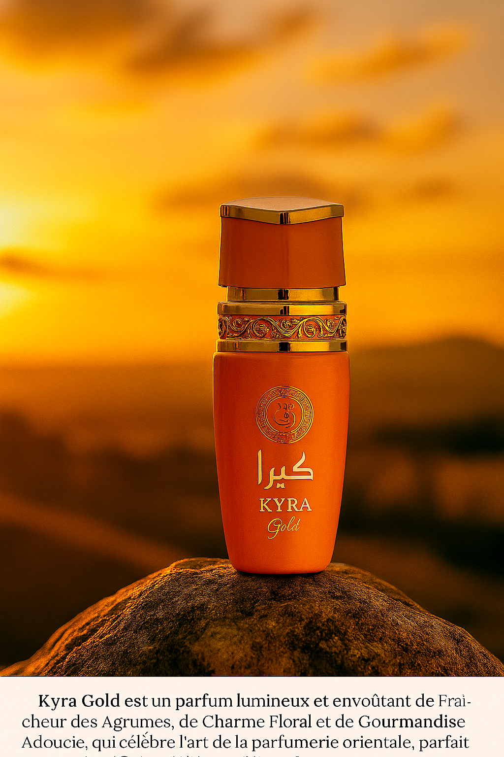 Kyra Gold est une fragrance éclatante et sensuelle qui marie la vivacité des agrumes à la douceur florale et aux accords gourmands orientaux, enveloppée dans un flacon lumineux aux reflets dorés, incarnant la féminité rayonnante, la modernité élégante et l’art raffiné de la parfumerie arabe dans une composition à la fois festive, chaleureuse et inoubliable.